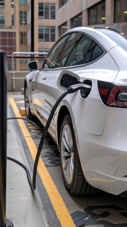 A white electric vehicle charging at a modern station, showcasing sustainable transportation and urban mobility solutions.