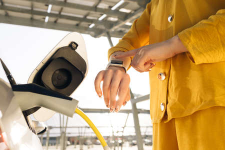 Businesswoman plugging in charging cable to to electric vehicle. Female hand inserts power connector into EV car and charges batteries, uses smartwatch for activates start charging.