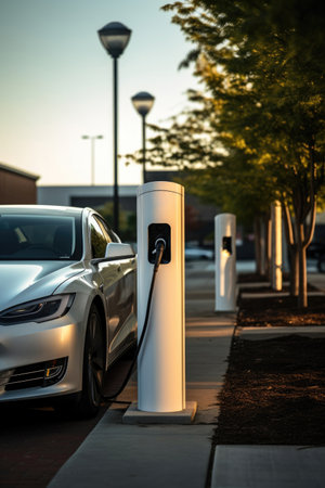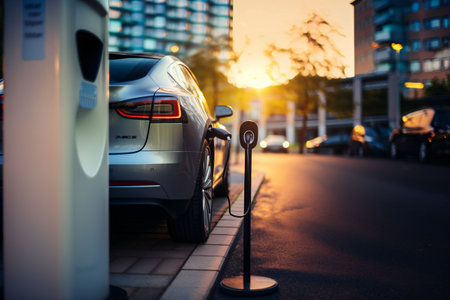 Golden Sunset Illuminates Electric Car Charging Station, Emphasizing Sustainable Transportation