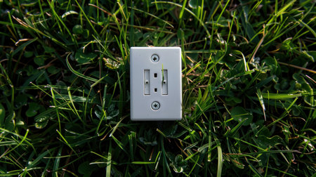 Electrical outlet mounted in green grass on a sunny day, symbolizing the connection between nature and technology