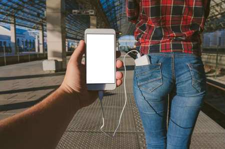 A mock-up of a Smartphone in the hands of a guy, stabs from the back pocket of a girl from a Power Bank against the background of the station