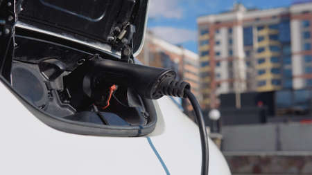 Electric car charging in the city. Close-up. Selective focus.