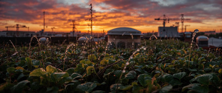 Rooftop garden with lush green plants covered in morning dew, illuminated by a vibrant sunrise. Construction cranes and urban structures visible in the distance.