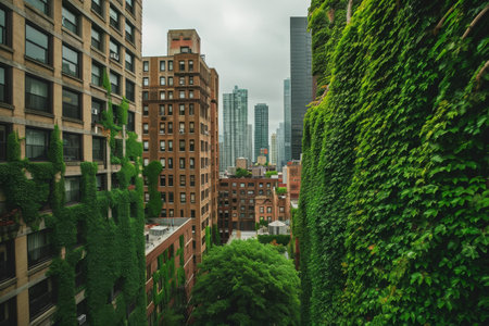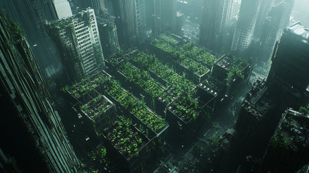 A birds eye view of a bustling cityscape with tall buildings, roads, and cars, as seen from a high-rise building, City skyline slowly being taken over by ivy-covered skyscrapers, AI Generated