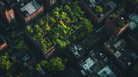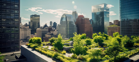 Lush greenery on a rooftop garden, nestled among towering skyscrapers, offers a sustainable, vibrant contrast to the surrounding urban landscape.