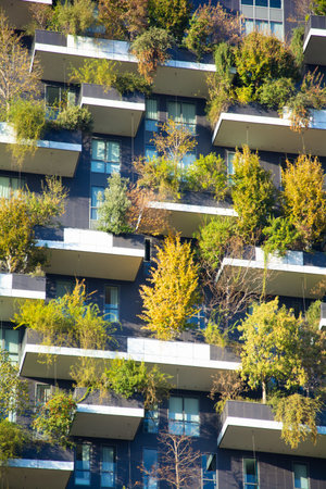 Milan, Italy. Bosco Verticale, view at the modern and ecological skyscraper with many trees on each balcony. Modern architecture, vertical gardens, terraces with plants