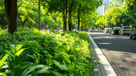 A vibrant urban landscape showcasing thick greenery along a tree-lined street, with city buildings in the background and a serene atmosphere.