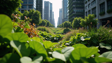 The vibrant greenery contrasts with the surrounding urban structures, showing the movement towards sustainable consumption practices.