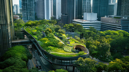 A stunning view of a green rooftop park in an urban setting, showcasing a blend of nature and modern architecture, ideal for relaxation and exploration.