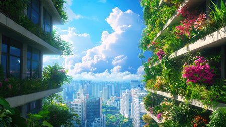 A stunning view of a vibrant urban landscape from a balcony adorned with lush greenery and colorful flowers, creating a peaceful, idyllic atmosphere.