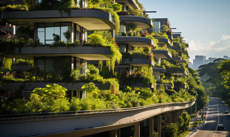 Modern eco-friendly skyscraper featuring lush green vegetation on balconies, highlighting sustainable and innovative architecture. Promotes urban greenery and environmental consciousness.