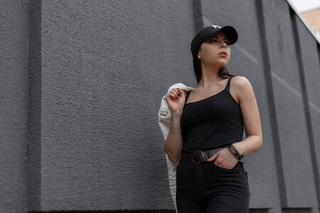 Beautiful young brunette woman in a black vintage t-shirt in a fashionable black cap in stylish black jeans with a white leather jacket near a gray building in the city. Cute girl model on a walk.