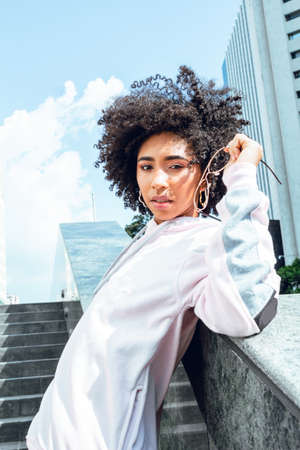 portrait of beautiful curly-haired afro girl model in the city looking at camera on sunny day