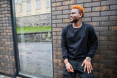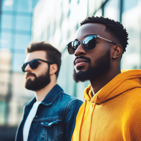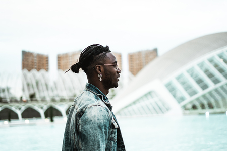 Portrait of handsome African American man on the street looking to the side with modern glasses.