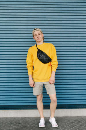 Full length portrait of a guy in casual casual clothes stands against a blue wall background, looks in camera and smiles. Happy young man in cap and bright casual clothes posing on wall background