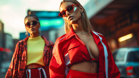two young black women posing looking at the camera with a gray concrete background, concept of friendship and urban lifestyle, copy space for text