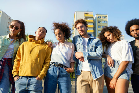 Multiethnic group of young hipsters stands together on street against gray brick wall. Diverse Stylish people in outerwear outdoor, youth culture