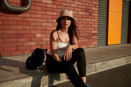 Beautiful young brunette woman with brown eyes in a stylish American baseball cap in a stylish leather white jacket in torn jeans enjoys the rest sitting on the asphalt on a summer day. Cute girl.