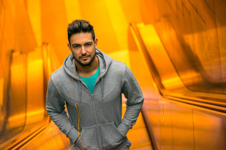 vertical portrait of an attractive young man posing in the streets of Barcelona