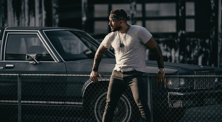Dangerous gangster on street. Crime, social issues. Hispanic gang members on Danger crime district. Gangsta style. Dangerous burglar. Dangerous man. Ethnic angry bad man outdoor. Dangerous street.