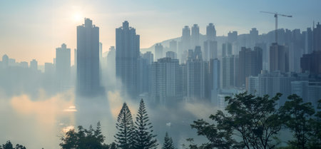 captures a serene cityscape during early morning with a thick layer of fog enveloping the skyline. The river in the foreground reflects the buildings and the bridge, creating a calm and peaceful atmosphere. The modern skyscrapers and contemporary architecture are visible through the mist, adding a sense of depth and tranquility to the scene. The combination of urban and natural makes visually appealing and versatile for various uses.