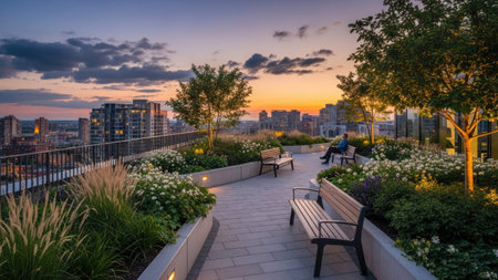 The rooftop garden offers a peaceful retreat with vibrant flowers against the backdrop of a city skyline as dawn breaks, casting soft light across the scene.