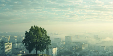 A tree is growing in the middle of a city. The sky is cloudy and the city is covered in fog