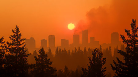 A city skyline shrouded in a thick, orange haze from wildfire smoke, with a glowing, red sun barely visible through the polluted atmosphere