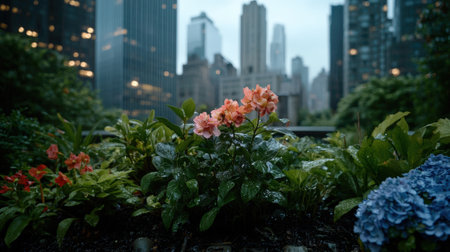 Lush greenery on a rooftop garden, nestled among towering skyscrapers, offers a sustainable, vibrant contrast to the surrounding urban landscape.