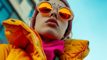 Portrait of a beautiful young woman in a yellow jacket and sunglasses
