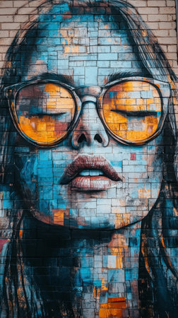Vibrant street art featuring a bold, colorful portrait of a woman with sunglasses, set against a bright mural backdrop.