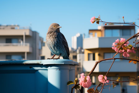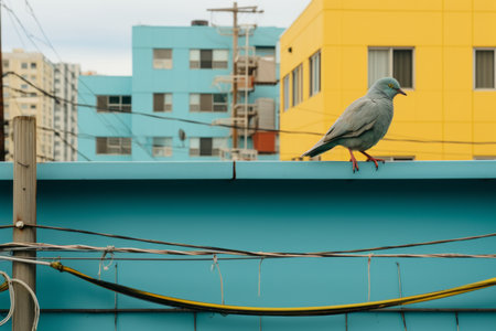 A lone gray bird rests on a city building rooftop, a serene contrast against the blurry urban backdrop.