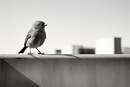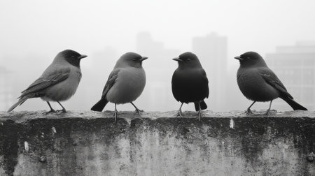 Four birds perched on a concrete ledge in an urban setting, black and white photography. Wildlife and nature observation concept
