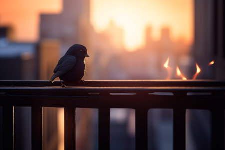 A wild bird perches on a fire escape as the sun sets over the urban skyline in the background.