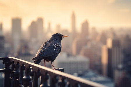 A serene silhouette of a bird perched on a ledge, with a misty city skyline at dawn creating a peaceful atmosphere filled with soft light.