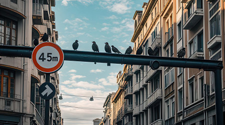 Traffic sign and pigeons on the street in Paris, France