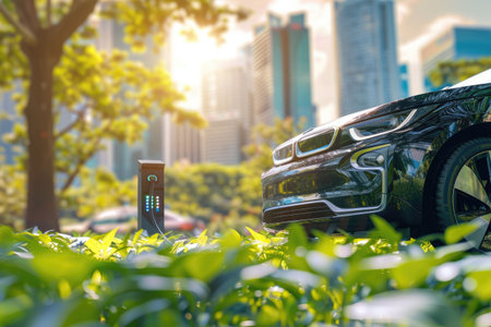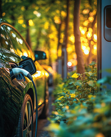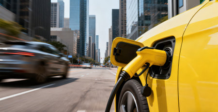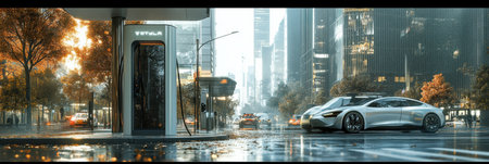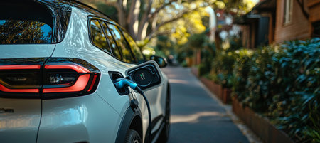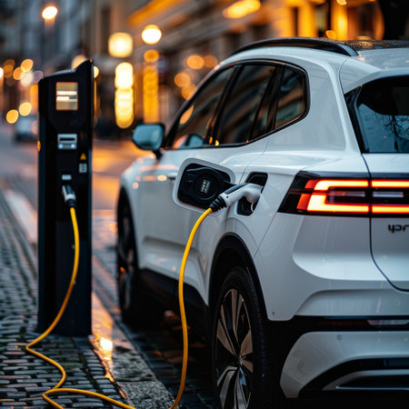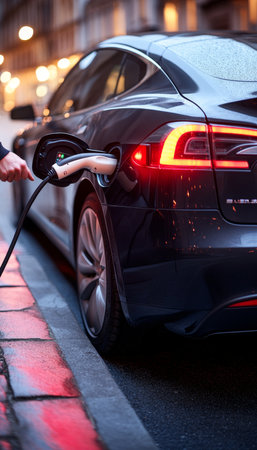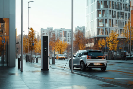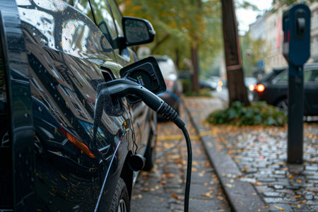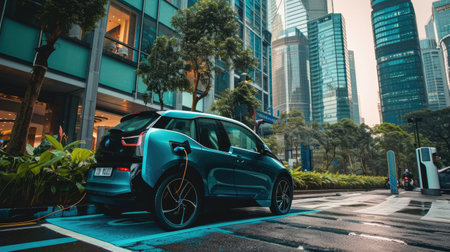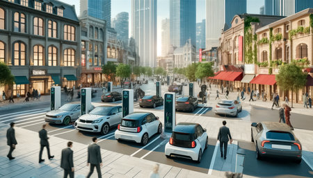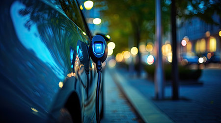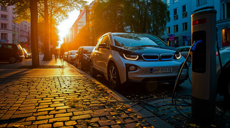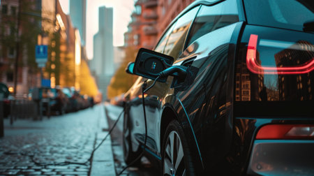 Electric Vehicle Charging on City Street, Sustainable Transportation and Urban Mobility.