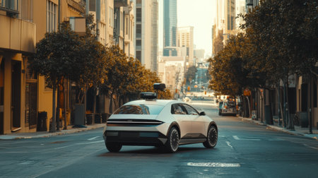 A self-driving vehicle navigates an urban environment, showcasing onboard AI technology as it moves down a quiet street.