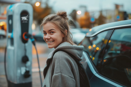 Young Woman Smiling at Electric Car Charging Station in Urban Setting