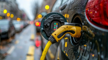 Electric car being charged on a rainy day, close-up of the power connector and charging port.