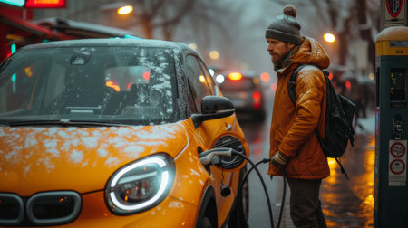 Focused man wearing a yellow jacket and beanie charges an electric car in snowy urban surroundings, embodying eco-friendliness and modern transportation.