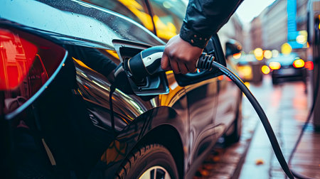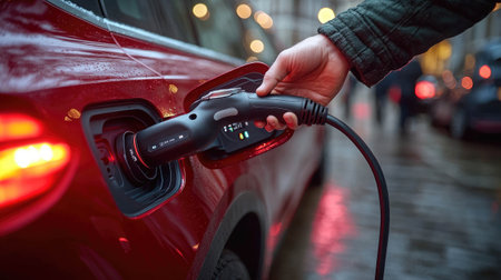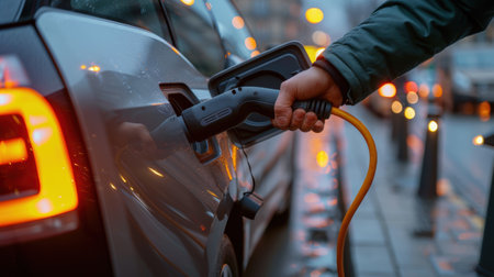 Urban Evening Commute Electric Vehicle Charging in the City, with Hand Holding Charger