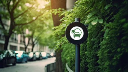 Electric vehicle charging sign on city streets. Created with generative AI technology