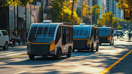 Fleet of electric delivery vans on a city street, powered by solar energy, promoting sustainable urban logistics and reducing carbon emissions