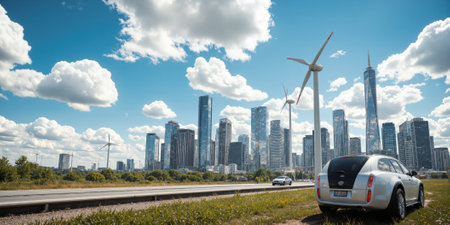 Renewable Energy Solutions Visual concept of renewable energy solutions, solar panels and wind turbines integrated seamlessly into a futuristic landscape, clean energy