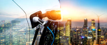 Power supply connect to electric vehicle for charge to the battery. . EV fuel Plug in hybrid car.