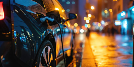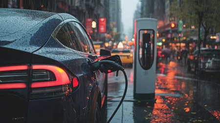 Electric car charging on rainy urban street at night. concept of sustainable transport, urban innovation, eco-friendly technology.