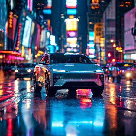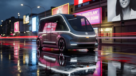 Futuristic autonomous vehicle navigating a vibrant wet city street at night with neon reflections