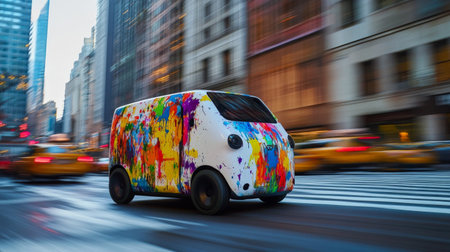 Colorful autonomous van driving in busy city streets