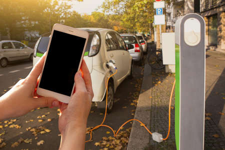 Hands with smartphone on a background of rental car at the charging station for electric vehicles. Car sharing.